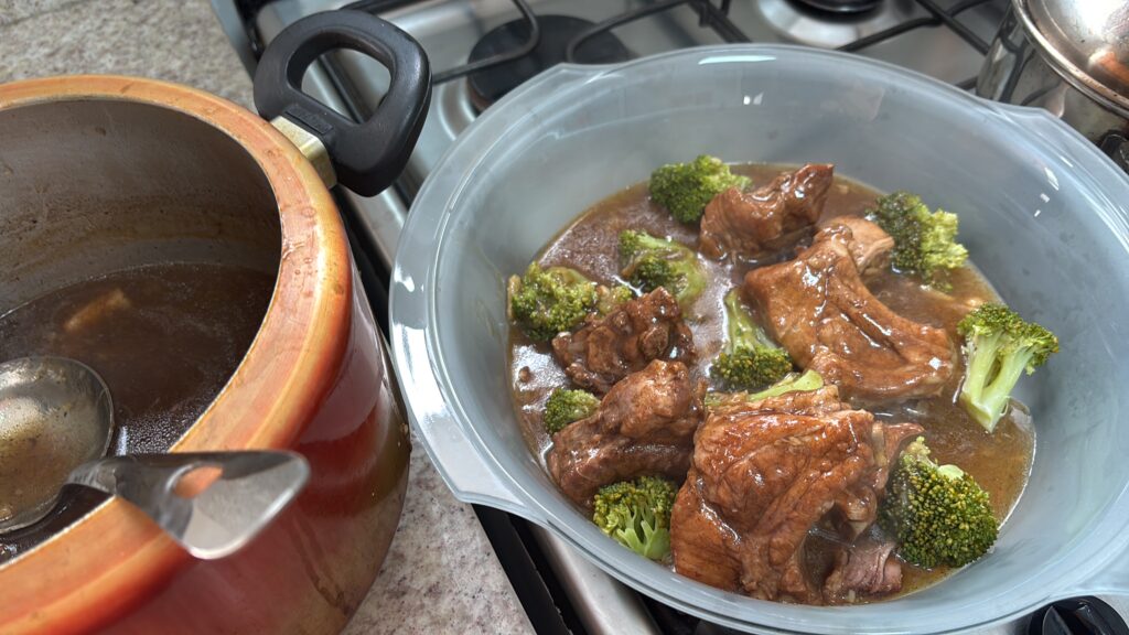 Costela de porco, cebola, alho, páprica picante, óleo de gergelim, shoyu e gengibre. Finalizei engrossando o molho com maisena. Aproveitei o resto do brócolis cozido do dia anterior e boas.
