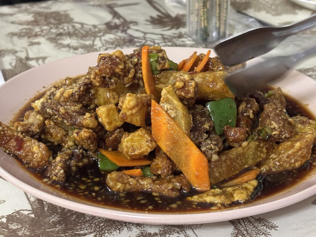 Essa carne de porco agridoce com batatas é sensacional.